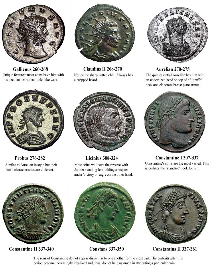 If you are unable to make out the lettering on your coin here are a few of the most familiar emperors you are bound to find. Keep in mind that you may not find an exact match or you may, indeed have a coin of an emperor not on this collage. If your coin is too deteriorated you should at least be able to figure out a date range for when it was minted. For example, if the emperor on your bronze coin has a spiky crown the coin was likely minted between the years 250-300. If it has a diadem (like a pearl necklace around the head) you can be fairly sure it was made after the year 340 or so. Nickel-sized coins featuring "bull-necked" tough guys were a design exclusive to the Tetriarchal years between c.290 and c.320. So don't be discouraged if you're unable to positively ID your coin, it is both meaningful and impressive to know that your coin was made within a specific date range so many centuries ago.