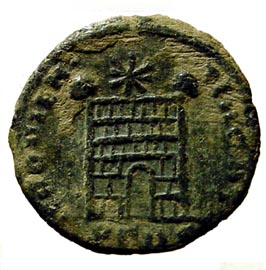 This interesting reverse occurs frequently in 4th and 5th century coins. There is no single reverse legend and the camp gates themselves have differing numbers of “rows” and turrets. Constantine I was a particularly prolific issuer of camp gates and these are a favorite among many collectors.