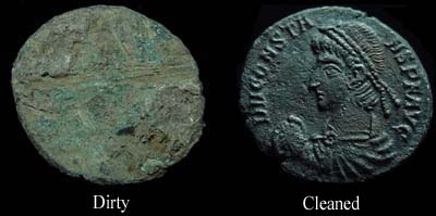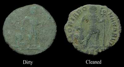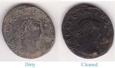 To many collectors cleaning is half the fun (or more!). There are many ways to clean these coins. In time you will find a preferred method of your own as most try slightly different variations and some zealously guard their secret coin cleaning recipes. Unfortunately, it takes a rather long time and a lot of effort to do a great cleaning job. After being under the ground for over 1,500 years these coins do not like to shed the dirt of the ages so easily. Rushing the process by taking shortcuts is only bound to disappoint you with inferior results and/or damaged coins.