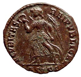Here’s Victory again, this time advancing left and again with crown wreath. This reverse was popular during the second half of the fourth century. Although several emperors issued this type those you find will likely be of Valentinian I or Valens.